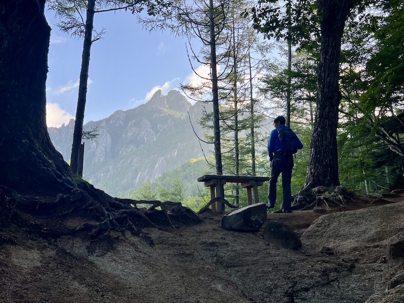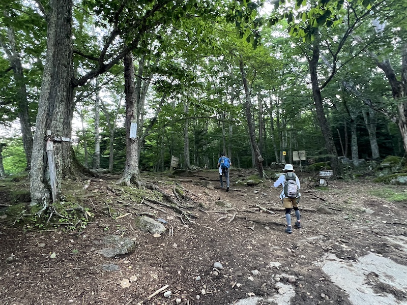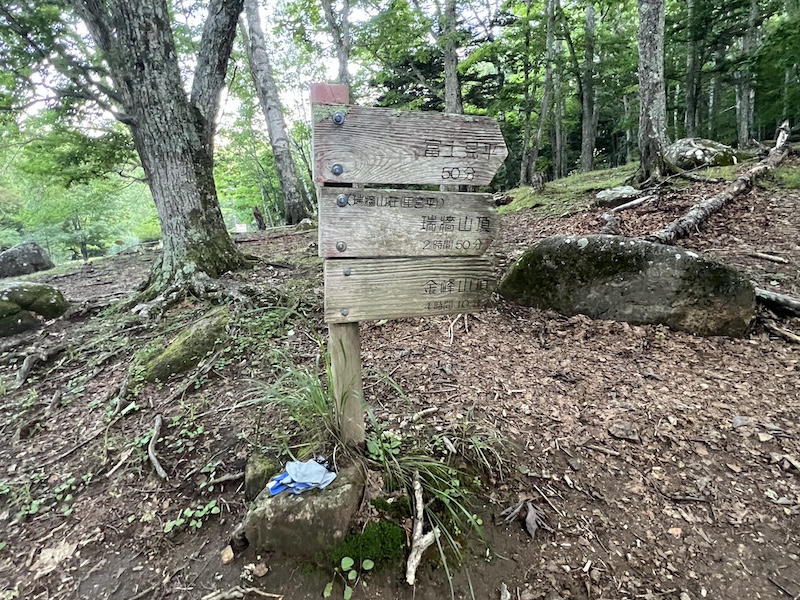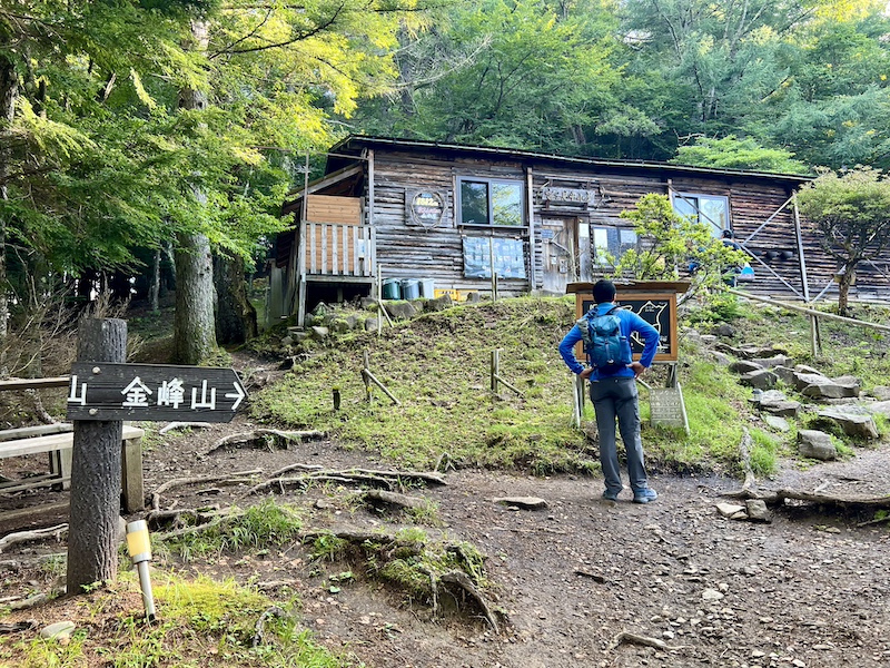 ここから金峰山と瑞牆山のルートが分かれるので、山小屋の右手奧から金峰山方面の道に進みます。やっぱり少しルートが短くて楽な瑞牆山にいく人が多いようで、この先は随分人が減った印象でした。