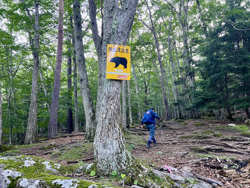 登山口のサインによると、ここから富士見平まで「50分」、金峰山頂まで「4時間10分」となっています。熊に注意のサインも。瑞牆山荘のオーナーの話では、この辺にいるクマはヒグマではなくツキノワグマなのでそれほど凶暴ではないということですが、鈴をつけて歩いている人も結構いました。
