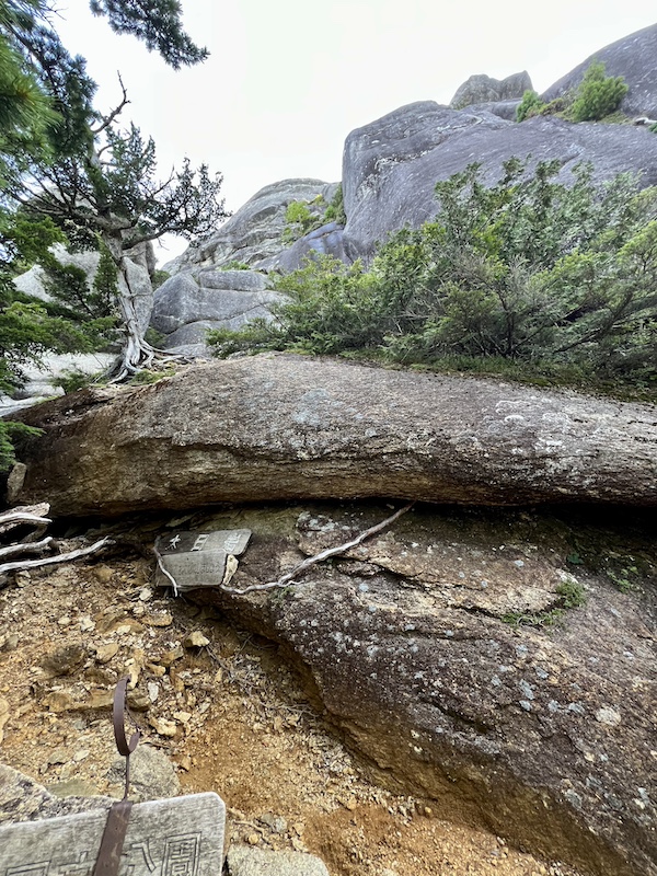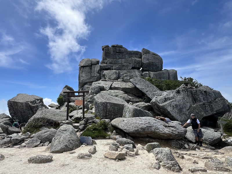 これが山頂(直前)の五丈岩。信仰の山なので、鳥居があります。御神体で、神霊の宿る岩と崇められているため、岩の上まで登ることは禁じられています。山頂のサインは、五丈岩の向かい側の少し先にある高い岩の上に設置されています。