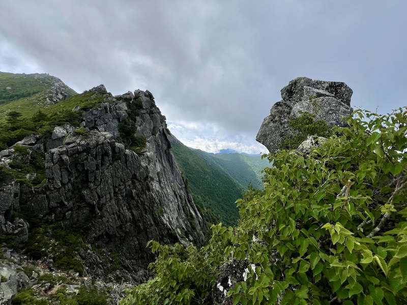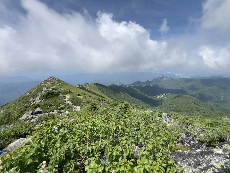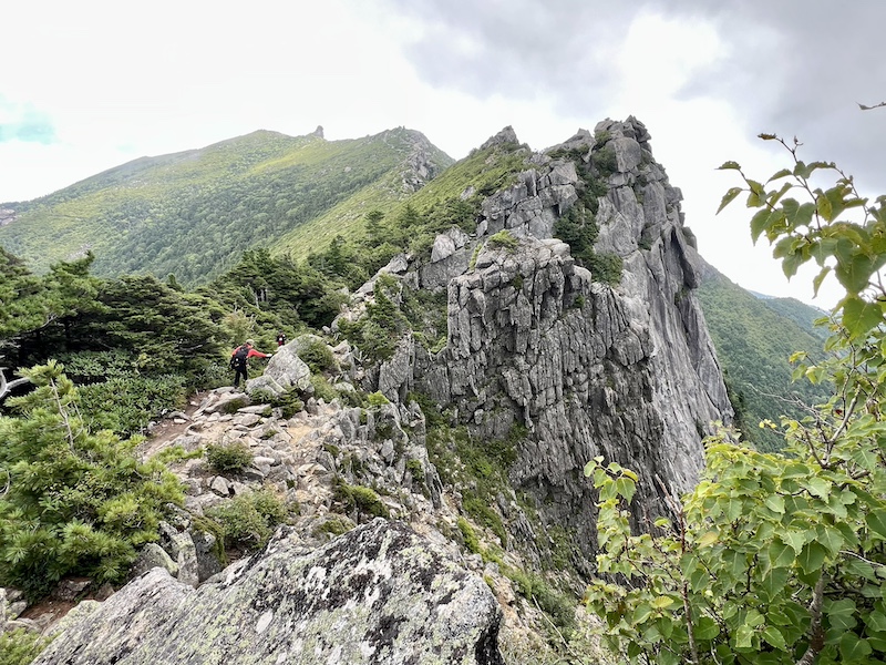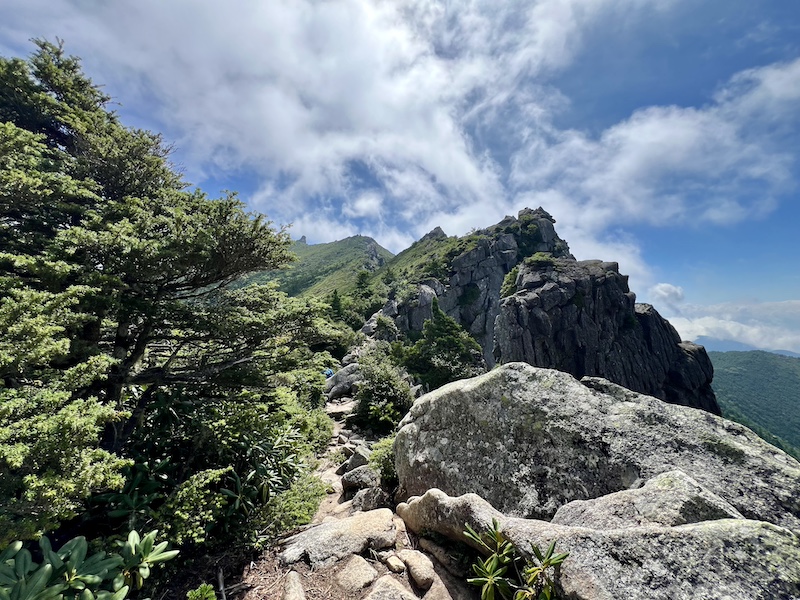 ここから先の稜線歩きがこのコースの醍醐味。トレイルは頂上に向かって左手に曲がっていく感じで、向こうに見えるすごい絶壁が「千代ノ吹上」です。