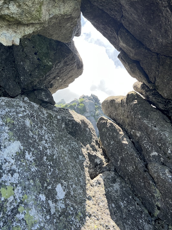 この辺はあまり足場がよくありませんが、少し道を外れて前方に進むと、覗き穴のようなスペースがあいている岩があり、隙間から向こう側を見ることができます。