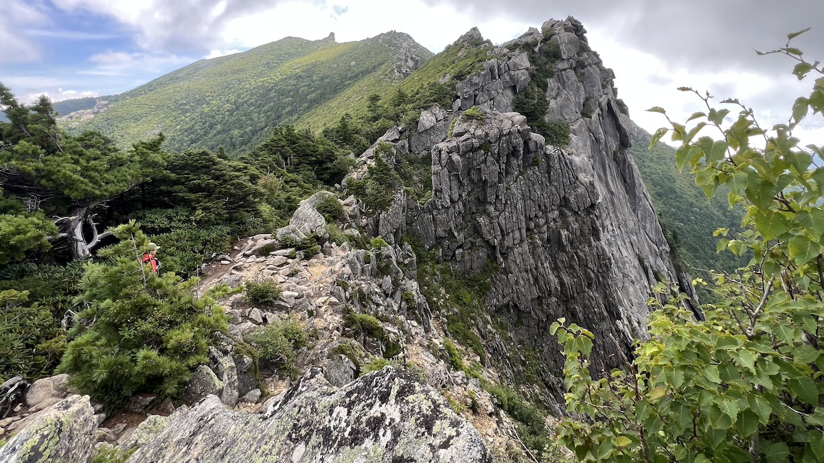 ここから先の稜線歩きがこのコースの醍醐味。トレイルは頂上に向かって左手に曲がっていく感じで、向こうに見えるすごい絶壁が「千代ノ吹上」です。