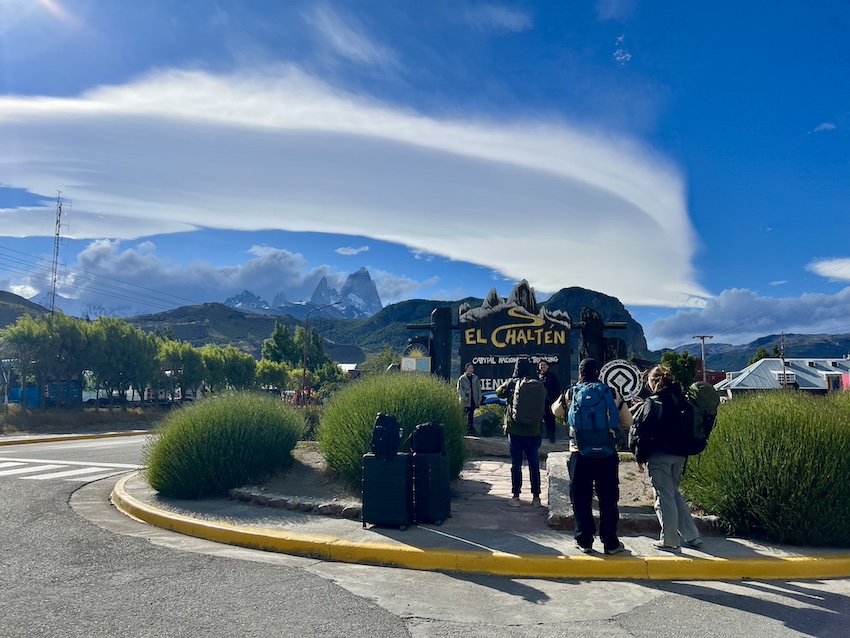 麓の村は、アルゼンチンのエル・チャルテン。ほとんどの人はバスで到着し、ターミナルのすぐそばに立っている看板が記念撮影ポットになっています。ここですでに向こうに頭が見えているのが、フィッツロイです。エル·チャルテンの「チャルテン」というのは「煙を吐く山」という意味で、フィッツロイ自体の別名ともなっています。煙を吐くというのは、霧や雲がかかっていることが多いということで、晴れていてもなかなか全景を拝むことができないと言われますが、この時はドラマチックな雲の下にちゃんと山頂が見えていました。
