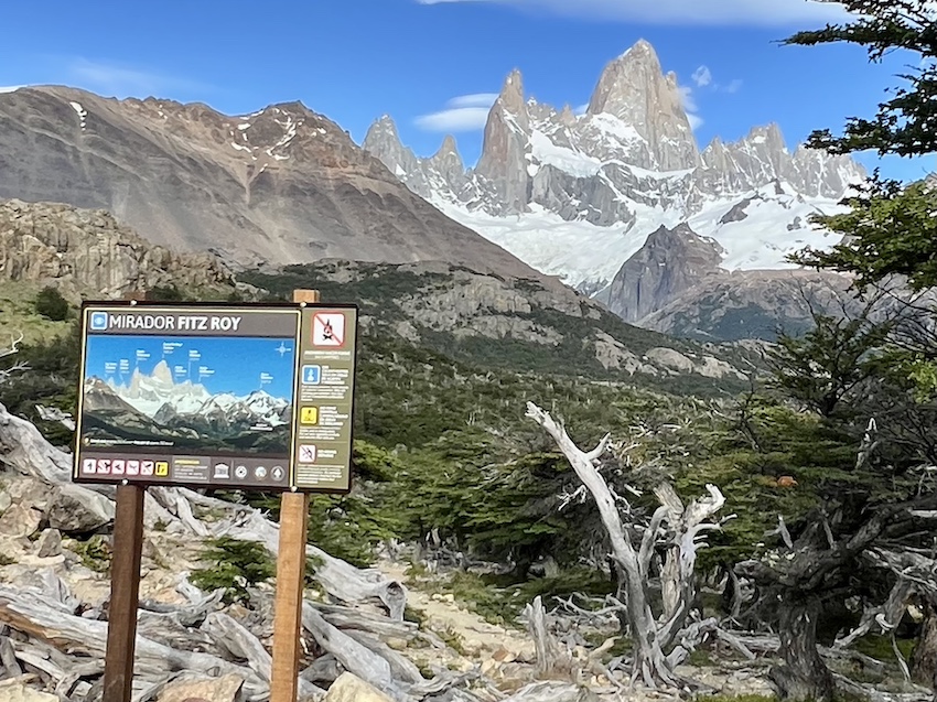 それぞれのピークの説明板もあります。中央の一番高くどっしりしたのがフィッツロイ(3405m)。その左の鋭い峰はポインセノット(3002m)、右がメルモーズ(2732m)です。