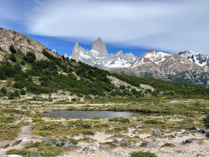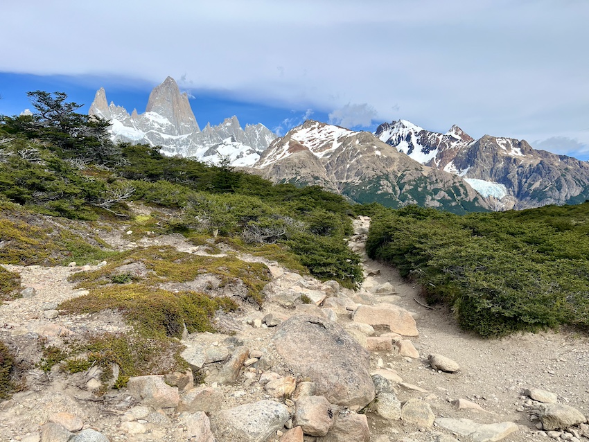 ここからしばらくは前方にフィッツロイを見ながら歩けるのでテンションは上がりっぱなし。道も比較的なだらかなので、風景が変わるたびにシャッターを押す手がとまりません。太筆で白いペイントをスッーとひとはけ入れたような独特の大きな雲も絵になります。