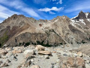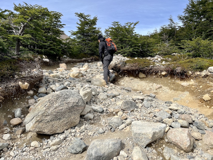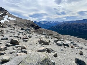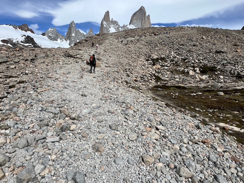 ようやく岩場を抜けたと思ったら、今度は小石でステップがずるずる滑る歩きにくいエリアが続きます。でも、もう丘の向こうにはフィッツロイの頭が見えているので、最後の力を振り絞って頑張ります。
