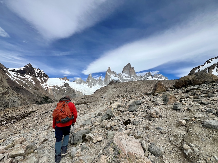 また、朝焼けに燃えるフィッツロイを見るために暗いうちから登り始める人もいて、それも素晴らしい体験になると思います。一方で、明るくなってスタートすると、足元がよく見えるのでより安全なうえ、かなり下の方からずっとフィッツロイの勇姿を楽しみながら登ることができるというメリットがあります。